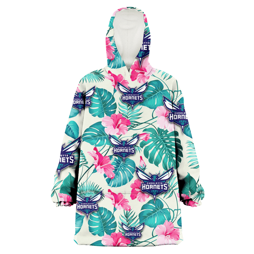 Charlotte Hornets Pink Hibiscus Green Leaf Beige Background 3D Printed Hoodie Blanket Snug Hoodie